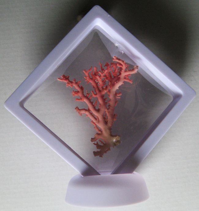 Korál je vložený do plastové krabičky s tenkou membránou. Můžete ho tudíž prohlížet ze všech stran, aniž byste ho museli z krabičky vyjmout.Folie je vyrobena z chemicky neutrálního polyuretanového filmu.